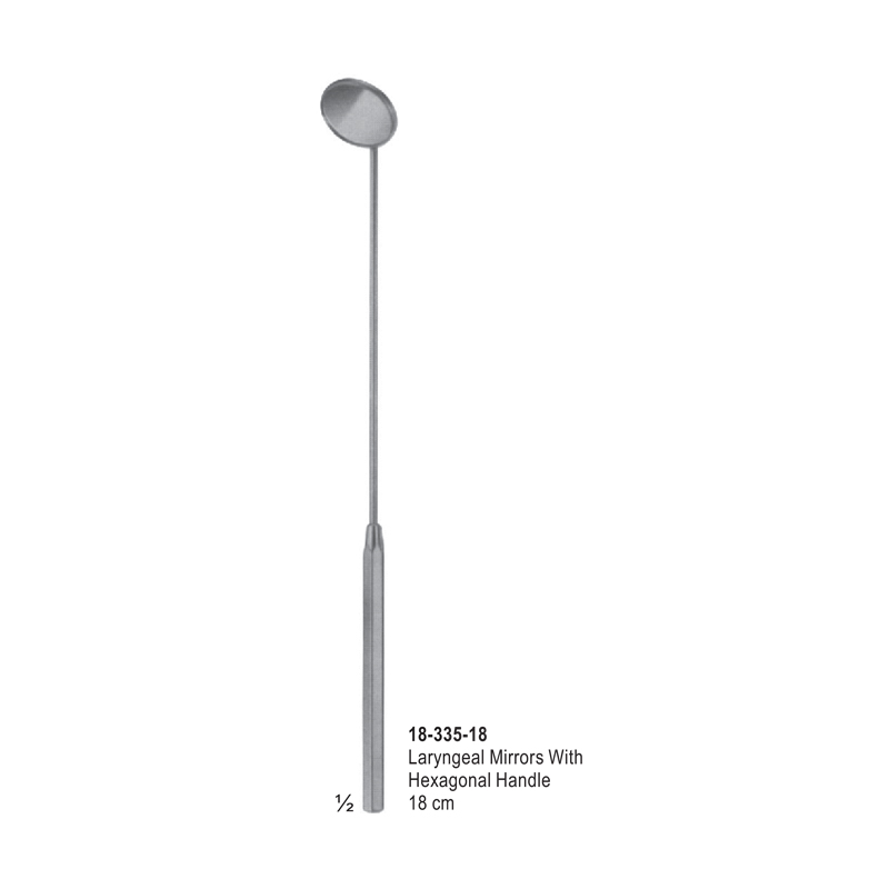A laryngeal mirror with a hexagonal handle is a diagnostic instrument used by doctors to visualize the larynx and other throat structures. It consists of a mirror mounted on a handle, with the handle featuring a hexagonal shape for improved grip and control. This design helps prevent rolling and provides a more secure hold during procedures. The mirror is typically made of stainless steel and is designed to provide a clear, reflective surface for visualizing the throat.