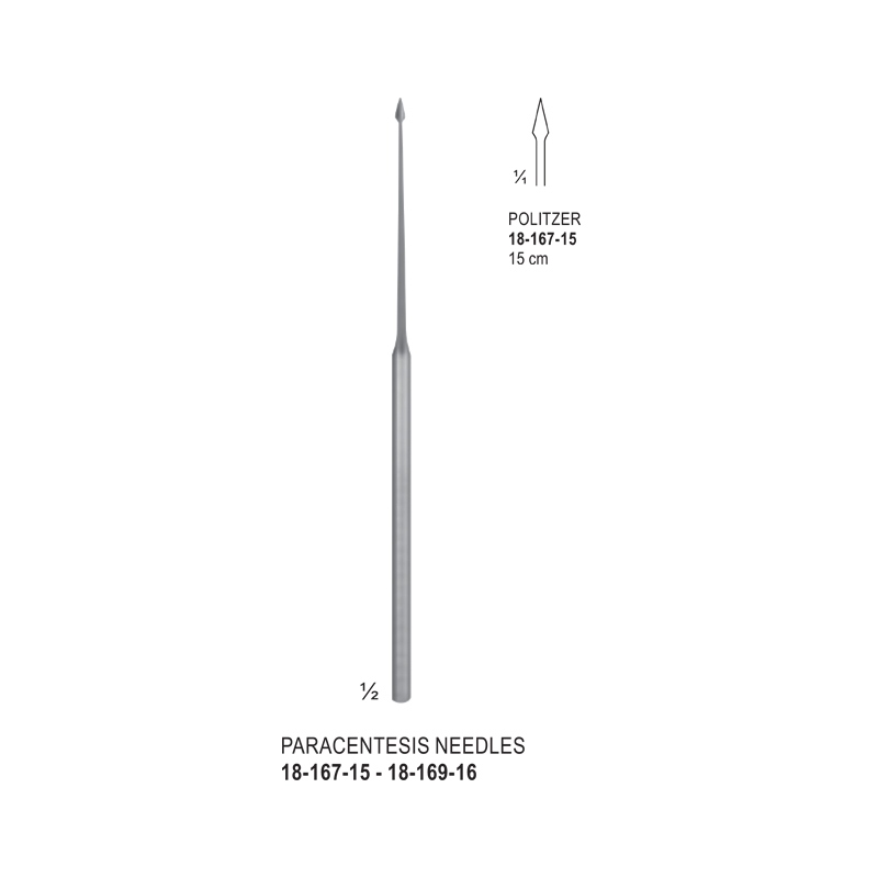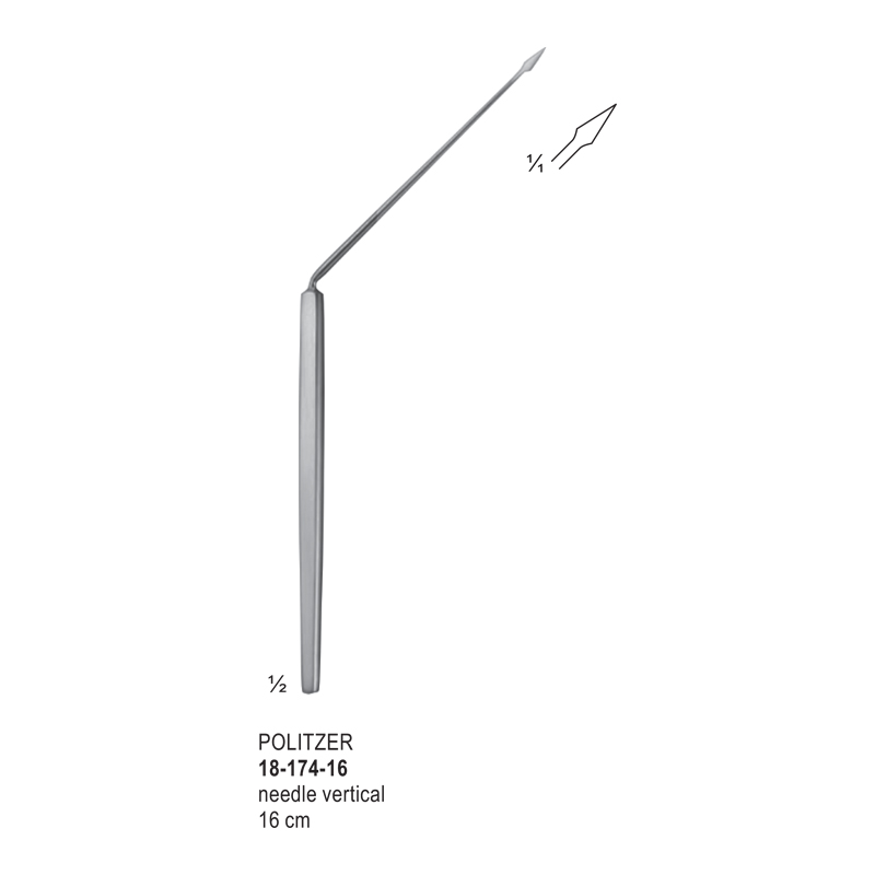 A Politzer tympanum needle is a surgical instrument used in otology (ear surgery) for making precise incisions and perforations in the tympanic membrane (eardrum). It is designed with a fine tip for accuracy and is typically made of stainless steel. The needle’s length, usually around 15 cm to 16 cm, allows for good reach and maneuverability during procedures.