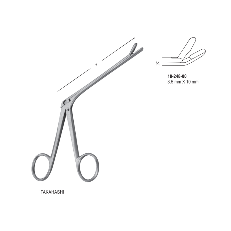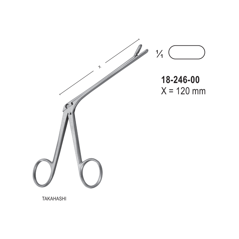Takahashi Ethmoid Forceps are specialized surgical instruments used in nasal and sinus procedures to remove tissue, bone, and polyps from the ethmoid sinuses. They are designed with fenestrated, cup-shaped jaws to grasp and extract tissue while minimizing damage to surrounding structures. The forceps are available with straight or curved necks and varying jaw sizes to accommodate different surgical approaches and patient anatomies.