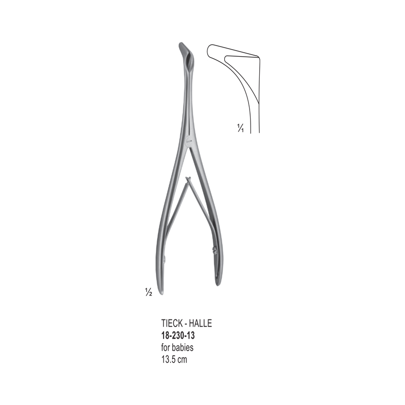 The Tieck-Halle Nasal Speculum is a surgical instrument used to retract the nasal walls and allow for visualization of the nasal cavity during examinations and procedures. It features a double spring mechanism and plier-style handles, facilitating one-handed operation and providing a clear view of the nasal passages.
